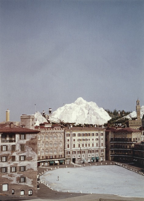 Ghirri utilise le parc à la fois comme un lieu réel et de fiction. Il photographie des bâtiments et des paysages qui sont déjà des reproductions – modèles réduits de monuments célèbres – comme… les montagnes caractéristiques des Dolomites. A juste titre, James Lingwood, commissaire de l’exposition, écrit: » les promeneurs partagent avec Ghirri le plaisir de l’artifice, de l’environnement et de la découverte de ses doubles. »