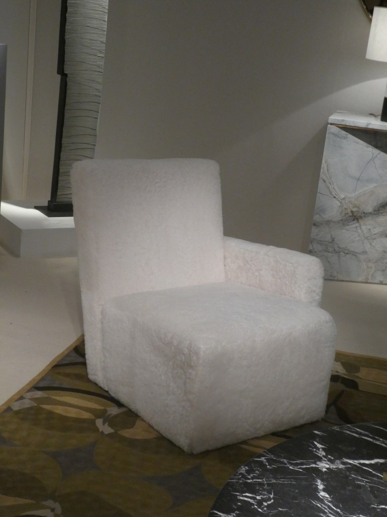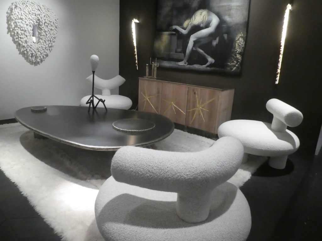 La white liste serait trop longue, mais citons encore le dernier fauteuil créé par Thierry Lemaire (stand éponyme, un nouveau venu au Pad), le Koumac, hyper moelleux et confortable, en peau de mouton avec un piétement d’ardoise (une version moins bling que celui en laiton poli), de forme géométrique et XL… Un architecte, architecte d’intérieur et designer auquel on doit de beaux projets en montagne notamment.