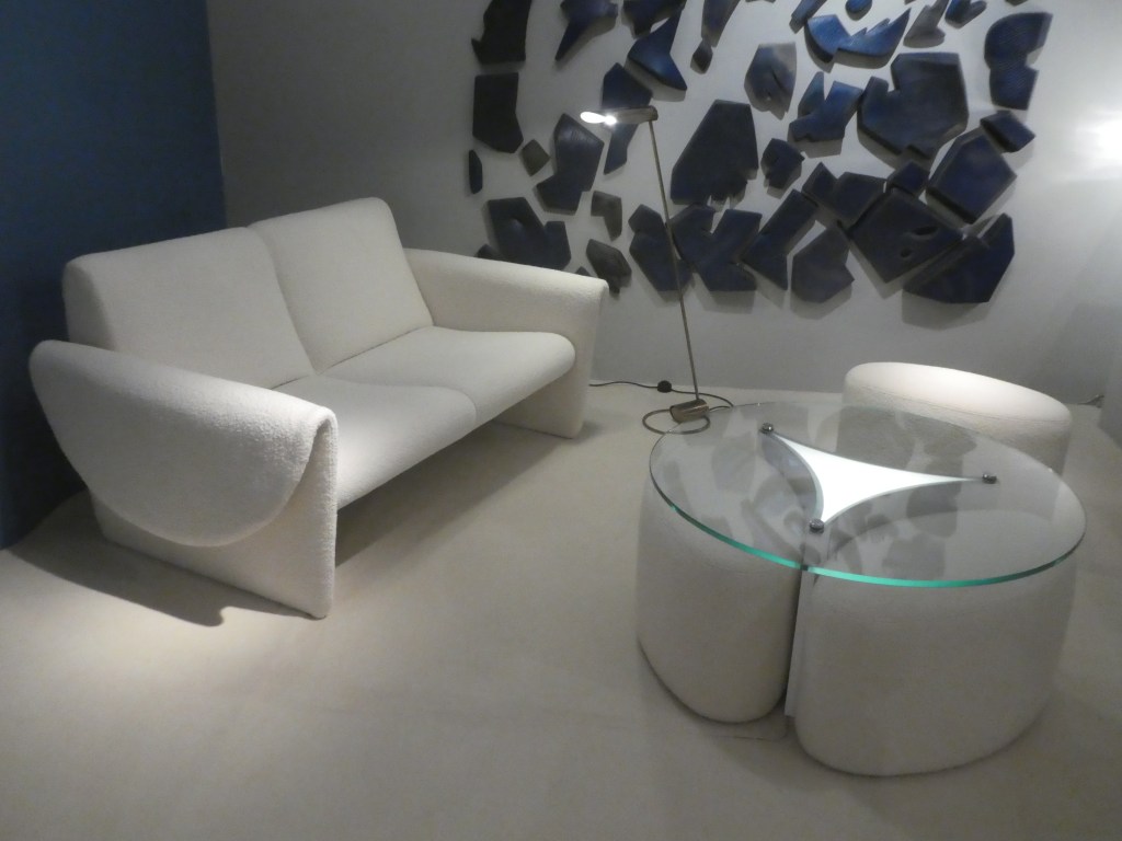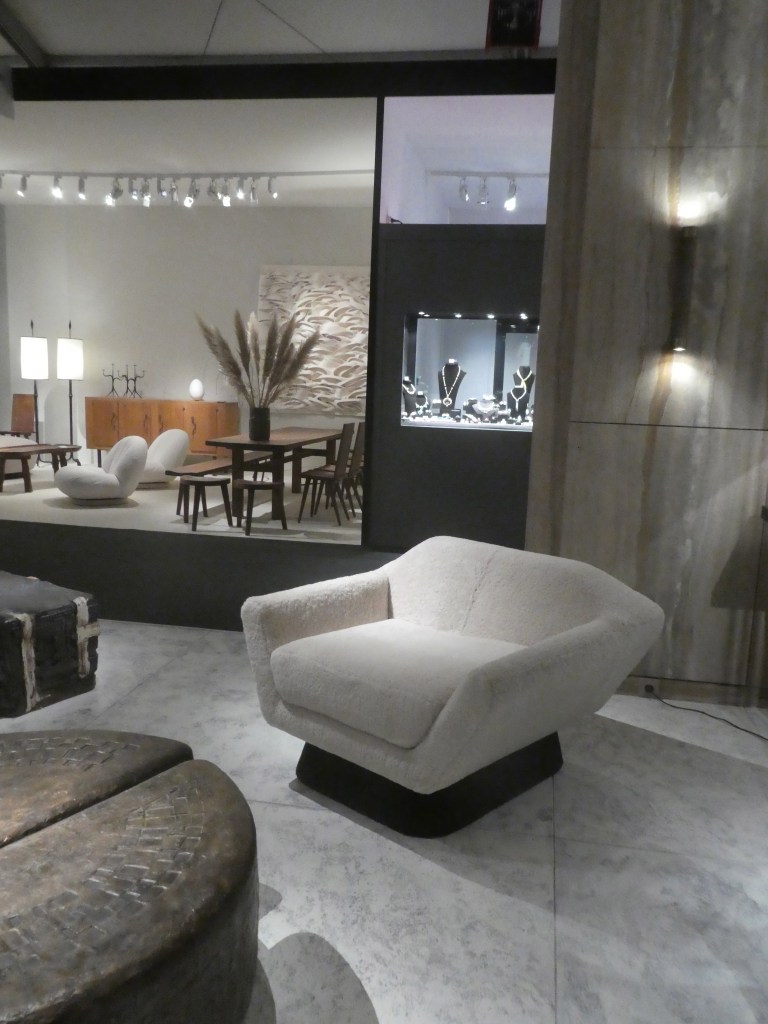 Coup de cœur (entre autres !) à la galerie Meubles et Lumières pour un salon complet, à l’encombrement minimal et à l’élégance discrète, des années 65, signé Louis Paolozzi qui s’habille du fameux tissu Judith de la Maison Pierre Frey à bouclettes, un des must du Pad cette année…