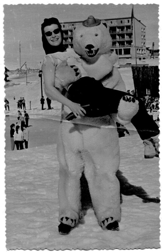 Jean-Louis Vuibert Guigué, l’heureux propriétaire de la librairie des Alpes, vient d’inaugurer (avant le confinement) une exposition intitulée « Ours » tout simplement. Délicieux mélange de dessins de la jeune artiste Manon Runel et de photos anonymes très drôles achetées par Lucile Buès, collaboratrice de la librairie et très fan d’images vintage. D’après elle : « Cette pratique se développe généralement en Suisse et en Allemagne entre les années 30 et 50. Le point de départ de cette mode est l’adulation par la population Berlinoise et les touristes de l’ours blanc du parc zoologique ». Mais l’engouement est tel qu’il se répand aussi en France comme en témoigne la photo prise à l’Alpe d’Huez, retrouvée récemment dans mes archives familiales !