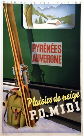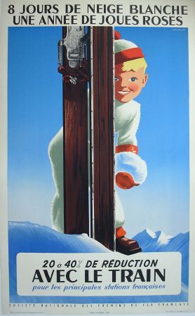 Cette affiche signée Roland Hugon résume à merveille les bienfaits de la montagne sur la santé…Simple, efficace, comme une bonne affiche doit l’être, elle délivre un message clair et suscite l’envie immédiate de partir à la neige, avec ou sans ski. Une belle réussite dont le but avéré était la promotion des sites de montagne accessibles en train! A tel point que près de deux décennies plus tard, en 1956, la SNCF réutilise l’affiche. Malheureusement en massacrant « très légèrement » (doux euphémisme) la mise en page… elle propose deux versions qui plaçent la SNCF au premier plan avec une offre intégrée au dessin qui détruit la force de l’affiche initiale et dont l’une hélas perd jusqu’à son formidable slogan qui se voit remplacé par un très banal « Faites du ski en France« ! Les publicitaires ne sont pas toujours très inspirés…
