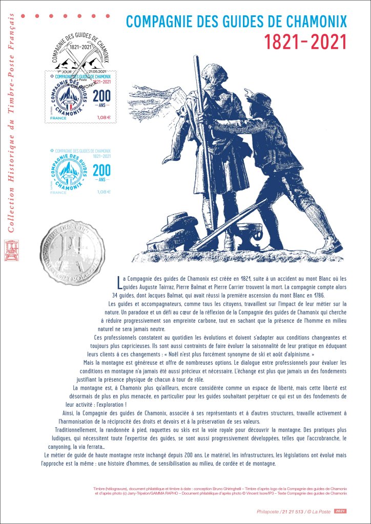 Philaposte a contacté Tristan Knoertzer, Chef de projet 200 ans Compagnie des Guides, pour lui suggérer l’émission de ce timbre commémoratif qui a été acceptée aussitôt. Au niveau national, généralement on ne fait pas de lancement en août, mois de la fête des Guides on avait donc trouvé le mois de mai, au moment de la Grande cordée. Évènement qui finalement aura lieu en juillet, crise sanitaire oblige.