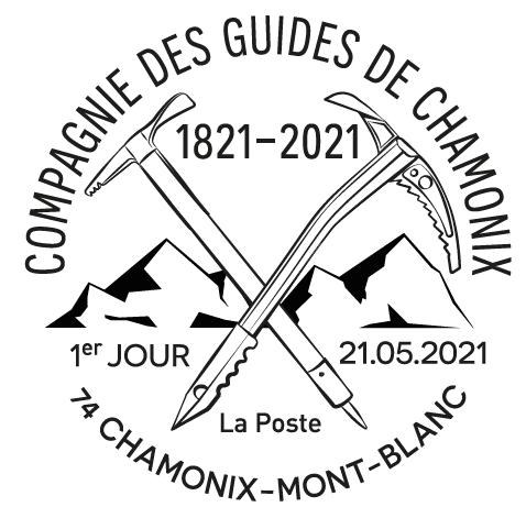 Ensuite, on a le timbre à date c’est-à-dire le cachet d’oblitération pour lequel notre proposition des deux piolets croisés a été retenue. Il est matérialisé par la date du premier jour de la commercialisation du timbre en avant-première, qui sera le 21 mai 2021. (Si l’on manque le premier jour, on peut faire la demande d’oblitération par correspondance pendant six mois).