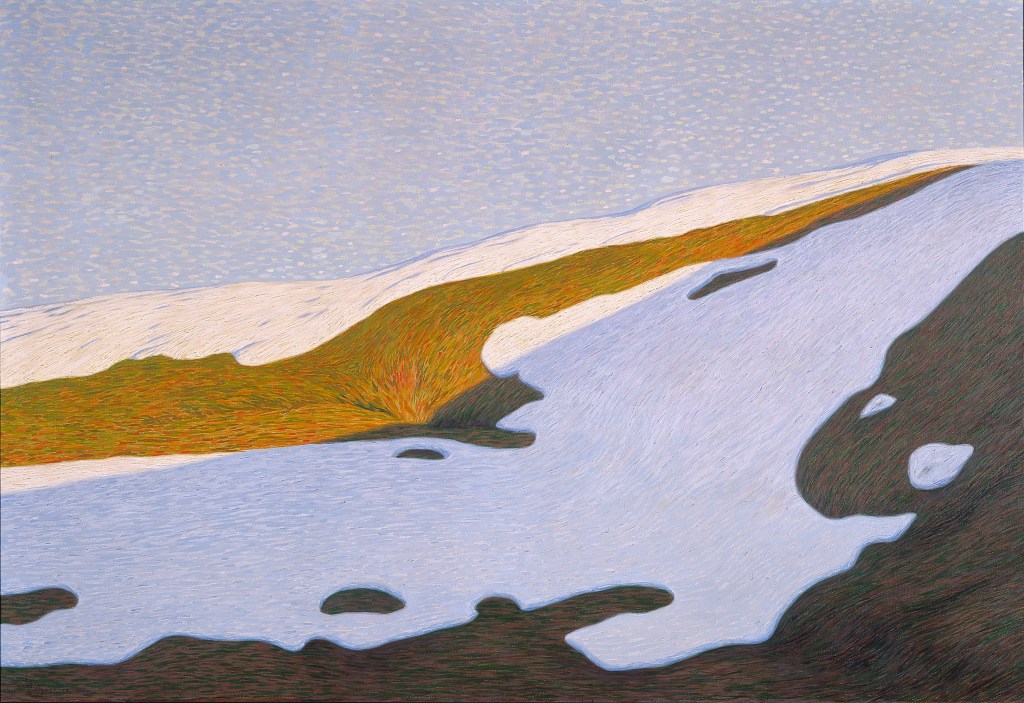Influencé à ses débuts par l’énigmatique Arnold Böcklin (1827-1901) qu’il considère « comme un Dieu » et sur les traces duquel il part en voyage d’étude arpenter le Tessin et l’Italie, Hans Emmenegger est à la fois graveur et peintre de plein air captivé par les variations atmosphériques. Lorsque ses compatriotes peignent des paysages de montagne, lui se focalise sur le phénomène de la fonte des neiges. Il ne cesse de dialoguer à travers son œuvre avec ses mentors et amis suisses Böcklin bien sûr, puis Amiet, Giacometti, Vallotton…ou bien encore Robert Zünd. Dès 1903, il se forge son propre langage pictural et se libère progressivement de la figure tutélaire de Böcklin pour « élaborer une esthétique propre en s’intéressant à des thèmes insolites – intérieurs obscurs de forêt, fonte des neiges, ombres portées ou reflets à la surface de l’eau – qu’il traite dans un style réaliste et synthétique.(…)Observateur subtil de la nature, Emmenegger est attentif aux phénomènes impalpables, transitoires, il aime traduire des effets simples et essentiels, révéler des mouvements invisibles » soulignent dans leur préface du catalogue Sylvie Wuhrmann et Corinne Currat (respectivement directrice et conservatrice adjointe de la Fondation de l’Hermitage, commissaires général et scientifique de l’exposition).