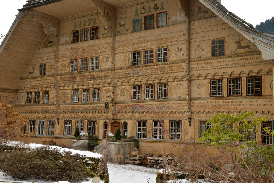 Le fameux « Grand chalet » explique Jean-Pierre Neff « n’est pas typique du Pays- d’Enhaut comme l’est dans notre village la Maison de la place, plus ancienne (1664). Il est de type bernois avec son toit à pans brisés couvert en tavillons. Il a nécessité des années de travaux et réquisitionné pratiquement tous les hommes du village. Malgré ses cent treize fenêtres, il est conçu à l’intérieur exactement comme un chalet traditionnel, autrement dit c’est comme s’il s’agissait de Legos, d’une superposition de huit ou dix chalets. Le bois massif donnait des contraintes de portée. A l’époque, on ne parlait pas d’architecte, ce sont des charpentiers qui bâtissaient, chacun avec leur style et les décorations en façade constituaient leur signature. Notamment dans celles des ailes du toit qui ici sont très travaillées. Cela n’a rien à voir avec le gigantisme de certains chalets d’aujourd’hui faits en béton et recouverts de bois, celui-ci est vraiment le chalet auto-porteur en madriers, entièrement constitué de poutres de bois qui provient en grande partie des forêts du revers à Rossinière (en Suisse on parle du revers et de l’adroit, en France de l’ubac au nord et l’adret le versant le plus ensoleillé). Le Grand Chalet, c’est mille mètres cubes de bois !