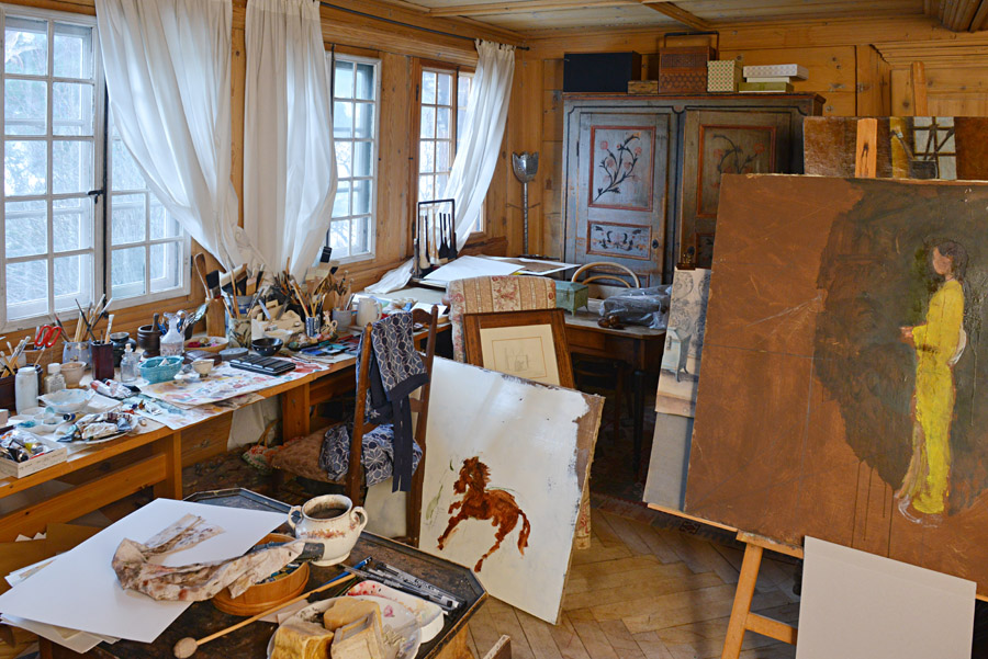 En face du grand Chalet se trouve l’ancien garage de la Pension de famille converti en atelier par Balthus. Il y passait ses journées et revenait au Grand chalet pour l’heure du thé, moment sacré d’échanges avec Setsuko et Harumi. Rien n’a bougé depuis sa disparition. Sanctuaire sur lequel veille jalousement Setsuko, il lui permet de venir régulièrement pour « respirer l’air de Balthus « . Setsuko explique « Balthus aura été au centre de ma vie, de mes pensées, de mes intérêts pendant près de quarante ans. Sans Balthus, le contact avec l’extérieur est plus direct, la réalité est mise à nu. Pourtant je me sens accompagnée, comme s’il continuait de me guider. »