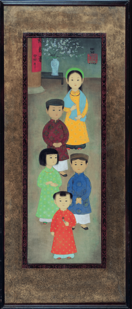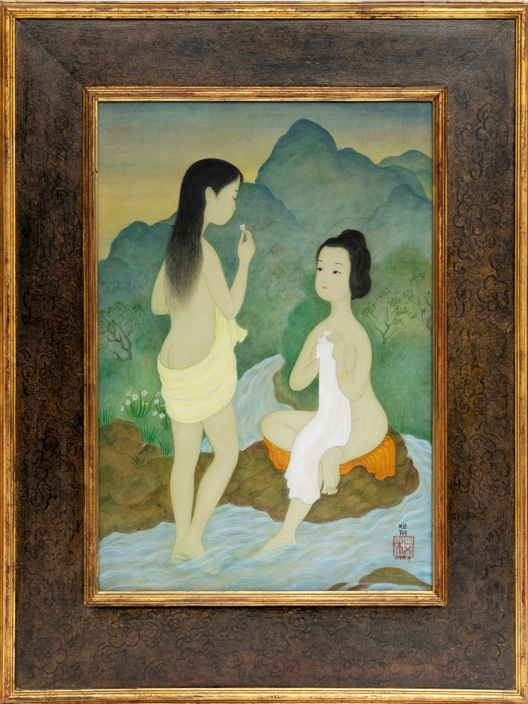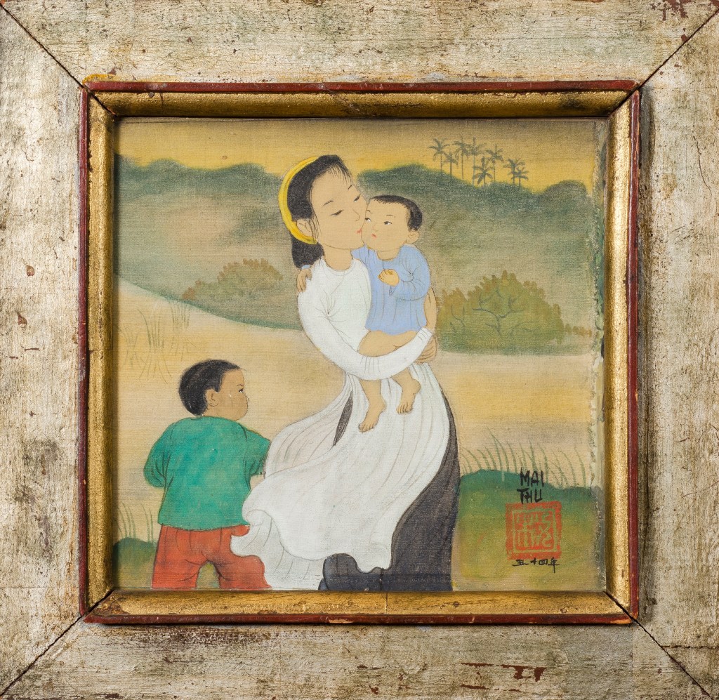J’ai toujours adoré ce peintre, son univers poétique avec des sujets issus pour la plupart du Vietnam traditionnel, la délicatesse de son regard qui explore l’âme de ses sujets, son univers serein et tendre, sa grande maîtrise technique, sa palette lumineuse et douce à la fois, ses compositions élégantes et étagées…cet art qui résulte d’un savant mélange entre Asie et Occident. « Ma peinture n’est pas dans la tradition même si elle en a le caractère par les thèmes auxquels je reste fidèle. Je fais également de la peinture à l’huile comme en Occident mais seulement pour moi car il y a tellement de peintres qui peignent que si j’avais adopté ce type de peinture occidentale, j’aurais eu bien du mal à sortir du lot » déclarait Mai Thu en 1972. Il a réalisé un documentaire sur la peinture sur soie en 1948 qui l’accompagne lors de différents évènements. Malheureusement il a disparu.