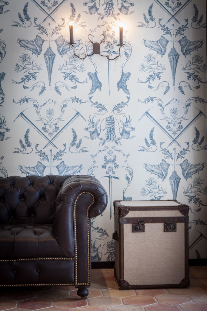 L’agence suédoise Stylt d’Érik Nissen Johansen a eu la charmante idée de développer comme fil rouge l’histoire d’Isabelle Straton dans cet hôtel ayant appartenu à ses descendants. Cette tendance à la « story telling », peu fréquente encore en 2013-2014 lors de la reprise puis de l’ouverture de l’établissement (par des suédois et des finlandais) trouve ici une cohérence parfaite dans la décoration. Le logo écusson reprend la silhouette de profil de l’alpiniste élégante mais énergique, piolet en main sur fond de montagne. Décliné en moquette et sur un amusant papier peint en différentes couleurs un motif exclusif rappelle son univers réunissant chaussures à crampons, ombrelle, bottines, piolet, têtes de bouquetins… Même la signalétique des chambres évoque avec humour Isabella et son amoureux !