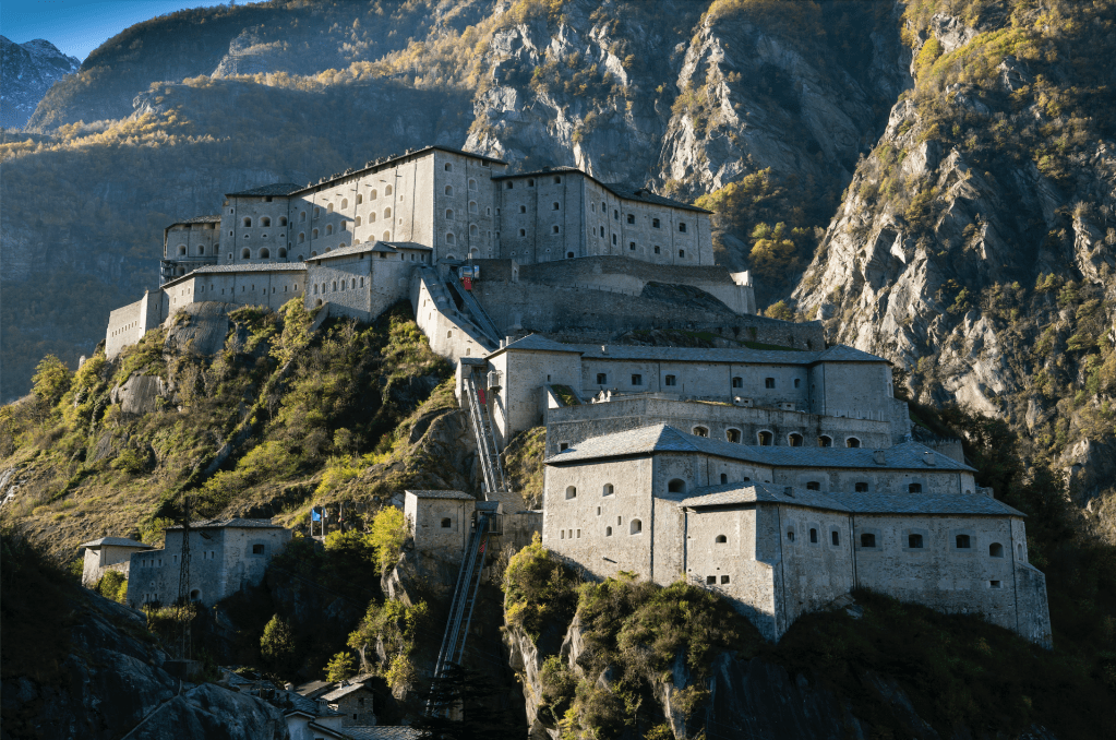 « Imposante place-forte de la première moitié du XIXe siècle située à l’entrée de la Vallée d’Aoste, Le Fort de Bard nait d’une histoire vieille de plus de mille ans. Destructions et reconstructions, visites et séjours de personnages illustres comme Napoléon, Stendhal et Cavour, font de Bard un site historique, monumental au grand pouvoir évocateur. »