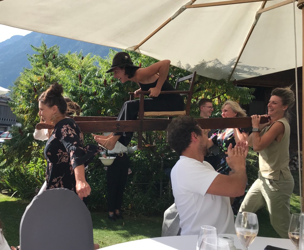 Perrine avec son équipe féminine gagne la course en chaise à porteurs !©Cécile Gruffat
