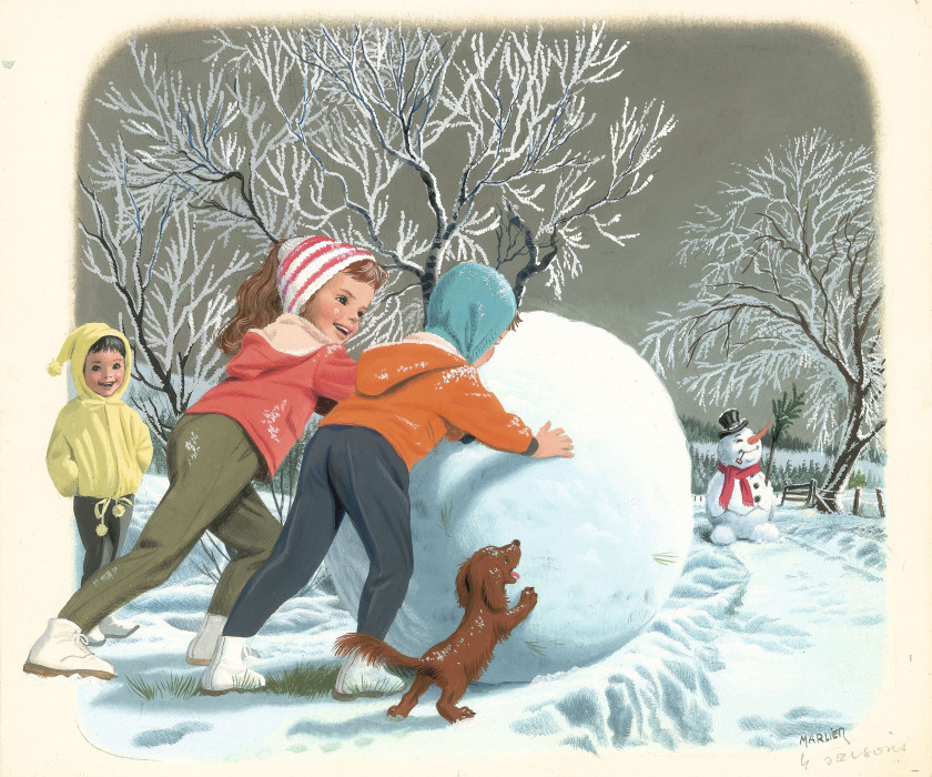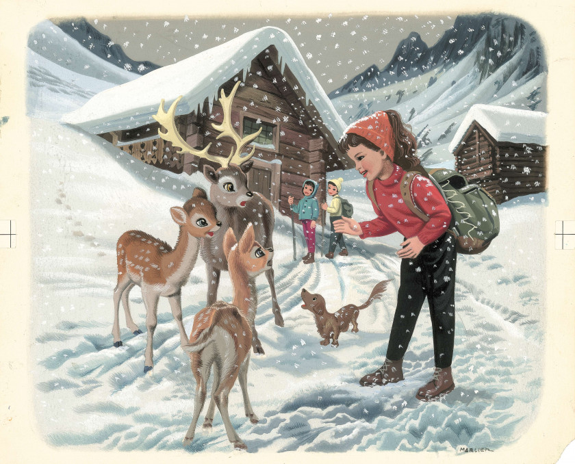 Le personnage de Martine inventé par Gilbert Delahaye, auteur et typographe avec la complicité du jeune dessinateur Marcel Marlier, répond à la demande des éditions Casterman auxquelles ils collaborent : imaginer une héroïne féminine pour les 5 à 8 ans. L’aventure prend forme avec « Martine à la ferme » et « Martine en voyage » publiés en 1954. L’illustrateur belge Marcel Marlier dépeint Martine avec son joli petit minois souriant dont les yeux pétillent de joie de vivre comme « une gamine qui n’est pas sage, mais essaie de bien faire » ! Pour François, fils du dessinateur, cette petite fille qui au départ reflète l’état d’esprit enthousiaste du baby-boom « est devenue intemporelle (…). C’est important de donner du rêve et de belles choses aux enfants. C’était la vision de mon papa lorsqu’il a imaginé ces albums. » Cette série phare déclinée en 60 albums comporte notamment un incontournable « Martine à la montagne » qui ne pouvait pas m’échapper ! D’autant plus que l’original de la couverture (ci-dessus) fait partie des dessins vedettes de la vente d’ Artcurial…