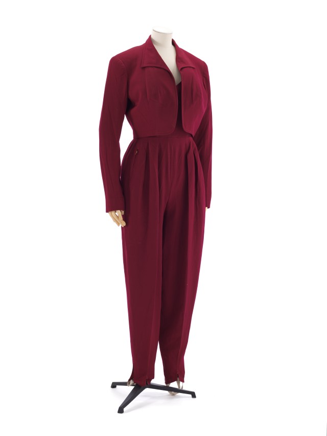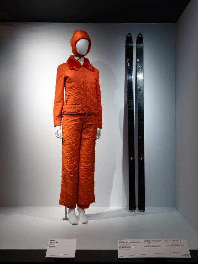 Autre innovation vestimentaire unisexe, la combinaison de ski, lancée à Saint-Moritz par Maurice Och à l’époque du premier fuseau et qui deviendra aussi un pilier de la garde-robe des sports d’hiver. Favorisant le mouvement sans entrave, elle dessine aussi une jolie silhouette sur les skis. Comme pour le fuseau, les couturiers s’en emparent et toutes les époques apportent leurs versions plus ou moins techniques et fantaisistes, monochromes ou très colorées et visibles sur la neige. Dans les années 50, on voit même des salopettes fuseaux ! La haute couture dévale les pistes avec talent. Un vestiaire dédié s’incarne à travers des créateurs de haut vol (cités précédemment) et ne cesse de s’enrichir dans un registre qui conjugue le sport avec l’élégance comme en témoignent certaines des pièces exposées et les courts métrages projetés au musée, aussi drôles que passionnants.
