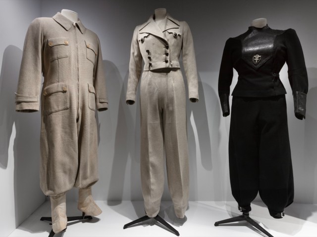 Il faudra attendre la fin du XIXe et surtout le début XXe pour assister à la naissance d’une mode d’altitude dans les autres activités liées à la montagne. Marie- Laure Guitton, commissaire scientifique de l’exposition et responsable des collections accessoires du musée, rappelle: « Le succès des sports d’hiver amorcé dans les années 1910 s’amplifie dans les années 1930 avec l’émergence de nouvelles stations, comme Megève. Les couturiers – Patou, Schiaparelli, Jane Regny, Hermès, Lelong… – et les maisons spécialisées – à l’instar du tailleur mégevan Armand Allard – conçoivent pour leur clientèle combinaisons, pantalons norvégiens et le célèbre fuseau, que l’on trouve dans la garde-robe tant féminine que masculine. L’engouement pour la montagne se confirmera au cours des décennies suivantes, les stations de sports d’hiver se multipliant après guerre (Alpe d’Huez, Méribel…). »