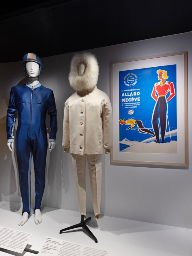 Avec l’engouement pour la pratique du ski dès les années 20, les maisons de couture créent de plus en plus de vêtements appropriés à ce sport. Dans les années 30 « c’est le triomphe de la silhouette androgyne caractérisée par l’emploi du pantalon fuseau » dont le chantre est Armand Allard à Megève où il a ouvert son atelier en 1926. Il en perfectionne le style et la souplesse pour parfaire les performances de champions, à commencer par Emile Allais. Le fameux « pantalon sauteur » en drap de Bonneval, plus près du corps, qu’il invente en I930 ne cesse de s’améliorer avec notamment, à partir de I952, l’utilisation des premières matières élastiques. Une belle affiche publicitaire, sur fond bleu azur, signée Gaston Gorde (1953) vante l’élégante silhouette et le confort procurés par ce vêtement. Dans la même vitrine, trône un ensemble crème (veste à capuche gansée de fourrure et fuseau de ski) conçu par Armand Allard et ayant appartenu à Dalida dans les années 60. Il témoigne du succès pour les créations du tailleur mégevan chez qui se fournit, dès la seconde moitié du XXe siècle, une clientèle cosmopolite, sportive et fortunée. Antoine Allard, troisième génération, a repris le flambeau après Jean-Paul, son père et la célèbre enseigne de la place du village, qui fêtera ses cents ans en 2026, reste pour la mode la plus emblématique de Megève ! Le fuseau Allard pour le ski et l’après-ski, pièce intemporelle parfaitement taillée avec son charme vintage, fidélise toujours une clientèle élégante.