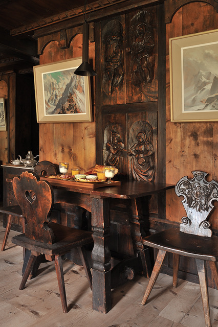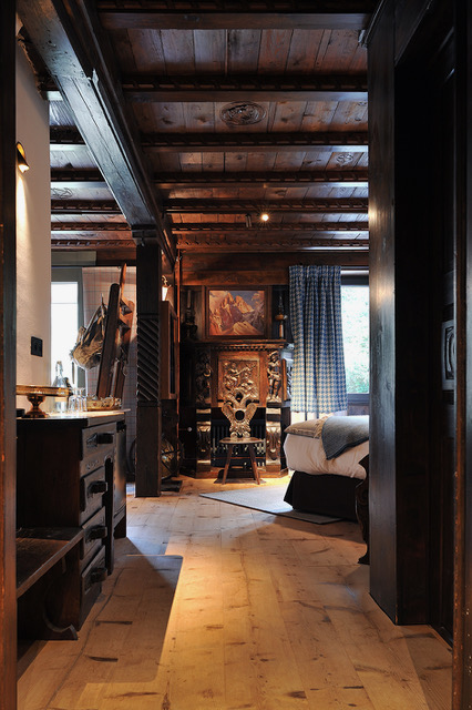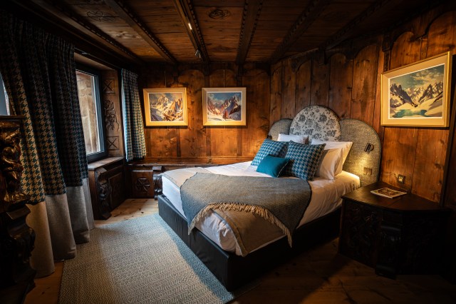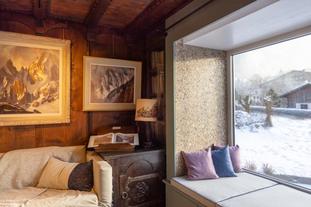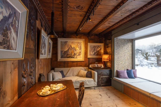 À deux pas du centre très animé de Chamonix, le chalet atelier Alpenrose (1943) chargé d’histoire, entièrement conçu par l’artiste où il a vécu avec son épouse et travaillé, abrite désormais une chambre d’hôtes atypique, unique en son genre et surprenante. Les boiseries foncées valorisent l’accrochage des lumineux paysages alpins de Marcel Wibault et ses meubles en bois sombre sculptés par lui. A son grand chevalet est accroché le sac à dos avec lequel cet artiste alpiniste partait peindre sur le motif. De jolis tissus bleu glacier illuminent cette suite spacieuse, une baie vitrée cadre le Mont-Blanc à contempler blotti dans une alcôve raffinée. Chaque détail compte. La modernité est saupoudrée par touches délicates pour associer passé et présent dans un confort ouaté. La présence de Marcel Wibault est tangible et l’authenticité de cette demeure reste intacte. Emma rend ainsi un bel hommage aux talents de son grand-père. Ce refuge artistique feutré offre une délicieuse parenthèse dans le temps et un dépaysement assuré.
